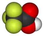 L'acide trifluoroacétique (TFA) est un composé chimique de formule CF3COOH. C'est un acide carboxylique fort en raison de la présence de trois atomes de fluor, fortement électronégatifs. Comparé à l'acide acétique, l'acide trifluoroacétique est environ 100 000 fois plus puissant. Cet acide est très utilisé en chimie organique.