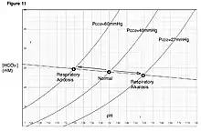Lors de l'acidose respiratoire, le patient hyperventile, afin de faire redescendre son taux de CO2 dans le sang. Toutefois, lorsque la cause de l'hypoventilation est liée à une impossibilité quelconque d'hyperventiler, l'organisme va réguler son pH sanguin en augmentant sa concentration de bicarbonates HCO3– dans le sang.