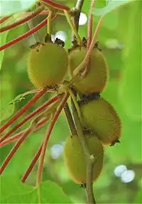 - Actinidia chinensis var. deliciosa (A.Chev.) A.Chev., le kiwi vert dont les jeunes rameaux strigoses[n 2], brunâtres ; fruits densément hispides