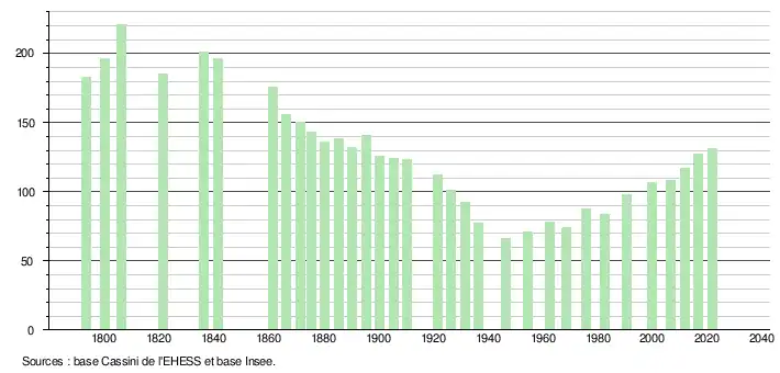 L'évolution du nombre d'habitants est connue à travers les recensements de la population effectués dans la commune depuis 1793. Pour les communes de moins de 10 000 habitants, une enquête de recensement portant sur toute la population est réalisée tous les cinq ans, les populations légales des années intermédiaires étant quant à elles estimées par interpolation ou extrapolation[19]. Pour la commune, le premier recensement exhaustif entrant dans le cadre du nouveau dispositif a été réalisé en 2006[20].