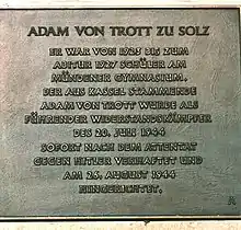 « Adam von Trott, 1909-1944. Mort avec ses amis dans le combat contre les corrupteurs de notre patrie. Priez pour eux. Suivez leur exemple[alpha 21]. »
