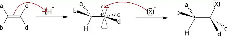 Cette réaction n'est pas stéréosélective, et la régiosélectivité est toujours liée au carbocation intermédiaire (H+ est toujours l'électrophile).