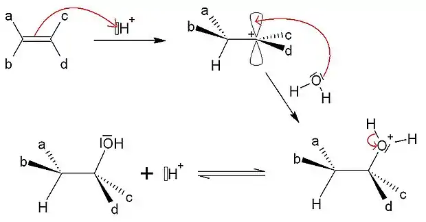 Selon un procédé identique, on peut hydrater un alcène pour former un alcool. On a besoin d'être en milieu acide pour activer la réaction (formation du carbocation). La forme oxonium R-O+H2 est en équilibre avec l'alcool sur le papier mais comme on est en présence d'une catalyse homogène acide, l'ion H+ formé réagit avec l'alcène de départ et donc déplace l'équilibre vers la formation de l'alcool.