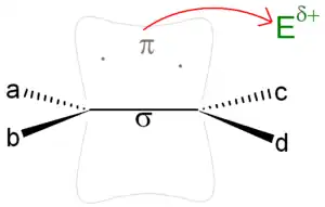 L'addition électrophile se fonde sur l'attirance qu'a un groupement électrophile pour le champ des électrons π d'une double liaison (d'un alcène dans la plupart des cas). Les liaisons π sont en effet bien plus cassables que les liaisons σ.