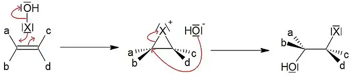 Les atomes d'oxygène n'ayant pas forcément la même priorité selon Cahn, Ingold et Prelog que les halogènes, on n'obtiendra pas les mêmes stéréoisomères qu'avec l'addition d'un dihalogène. On a toutefois toujours une réaction diastéréospécifique.