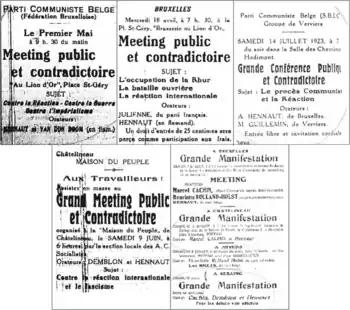 Ensuite, les oppositionnels constituent un comité provisoire chargé d'organiser l'opposition et annoncent une série de meetings dans tous les centres communistes du pays[52]. En même temps, ils annoncent la sortie de deux hebdomadaires en français et néerlandais, Le Communiste et De Kommunist. Hennaut écrit souvent dans les deux journaux. Il s'occupe de la chronique Internationale et écrit notamment sur les Procès de Moscou[56].