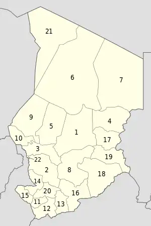 Le Tchad, indépendant depuis 1960, a longtemps été divisé en 14 préfectures. Puis, en 1999 il est divisé en 28 départements. Enfin, depuis 2008, il est divisé en 23 régions.