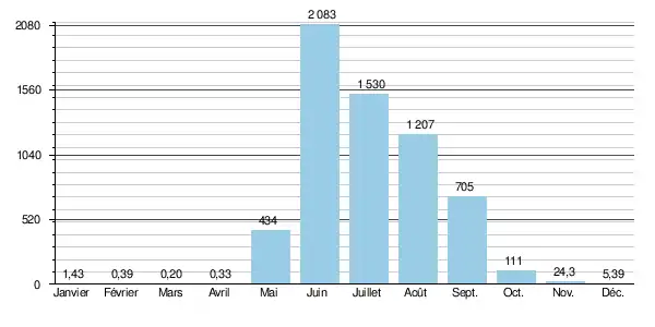 Le débit moyen mensuel observé en mars (minimum d'étiage) est de 0,20 m3/s (200 litres), tandis que celui du mois de juin se monte à 2 083 m3/s, ce qui souligne l'amplitude extrêmement importante des variations saisonnières. Sur la durée d'observation de 63 ans, le débit mensuel minimal a été de 0,00 m3/s à plusieurs reprises entre janvier et avril (arrêt de tout écoulement), tandis que le débit mensuel maximal s'est élevé à 5 570 m3/s en (plus de trois fois le débit moyen du Rhône en fin de parcours).
