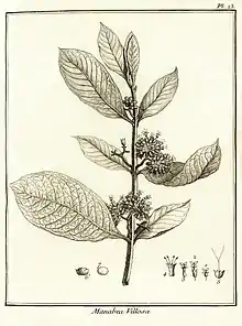 LE MANABO velu. (Planche 23.)La racine de cet arbrisseau pouſſe des tiges droites, velues, remplies de moelle, & à quatre angles. Elles s'élèvent de ſept à huit pieds. Elles font garnies, dès le bas, de feuilles qui ſont deux à deux, oppoſées, & diſpoſées en croix. Ces feuilles ſont entières, ovales, terminées en pointe, vertes en deſſus, couvertes en deſſous d'un duvet blanchâtre.