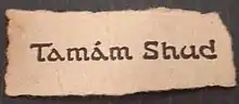 Sir John Burton Cleland trouva également un morceau de papier portant l'inscription « Tamam Shud » dans la poche du pantalon de la victime[42].
