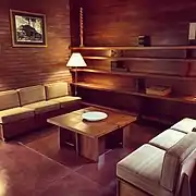 La demeure multi-niveau de 210 m2 est construite en brique et panneaux sandwich de bois de cyprès, avec salon, salle à manger et cuisine en espace ouvert, 3 chambres, et nombreux meubles intégrés de Wright[2],[3],[4],.