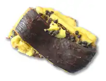 Elle ressemble à un gros petit pain rempli de crème pâtissière garnie de pépites de chocolat et recouvert d’une couche de chocolat fondu.