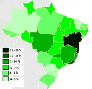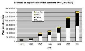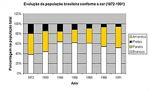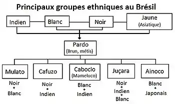 Lors du recensement de l’Institut brésilien de géographie et de statistiques (IBGE) de 2010, 7,6 % des Brésiliens identifiaient leur couleur de peau ou leur race comme noire, 43,1 % comme brune (pardo) et 47,7 % comme blanche[4]. Ces données toutefois sont à analyser avec précaution, compte tenu de la tendance historique au branqueamento que l’on observe dans les auto-classifications raciales dans ce pays[6],[7]. Pour des raisons d’ordre statistique, l’IBGE classe comme population noire les noirs et bruns tout ensemble[15], encore que cette méthodologie ait été contestée par d’aucuns, au motif que la majorité des bruns sont des métis, qui ne s’identifient ni comme noirs, ni comme blancs, mais comme un groupe à part[14]. De surcroît, beaucoup de bruns ne sont pas descendants d’Africains, mais d’Amérindiens, principalement dans les États du nord[16].