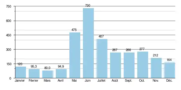 Le débit moyen mensuel observé en mars (minimum d'étiage) est de 80,0 m3/s, soit plus ou moins 11 % du débit moyen du mois de juin, maximum de l'année (730 m3/s), ce qui souligne l'amplitude assez modérée des variations saisonnières. Sur la durée d'observation de 23 ans, le débit mensuel minimal a été de 48,5 m3/s en , tandis que le débit mensuel maximal s'élevait à 1 060 m3/s en .
