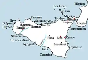 Celui-ci, alors en Sicile, a pris le titre de roi de l'île[36]. En effet, en 307, il a fait tomber Héraclée et s'est allié à Thermae (sa cité d'origine d'après Diodore de Sicile). À Syracuse, il a éliminé une partie de ses adversaires politiques. Le port est néanmoins bloqué par une trentaine de navires carthaginois et Agathocle ne peut sortir qu'avec l'aide de 18 bateaux étrusques venus à son secours[37],[note 2].