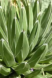 La rosette est composée de feuilles courtes, rigides, épaisses, de section triangulaire et de couleur vert foncé. Elles sont terminées par une pointe de une à 3 épines de 1,5 à 3 cm de long. Par contre, il n'y a pas d'épines sur le bord des feuilles à l'inverse de la plupart des agaves.