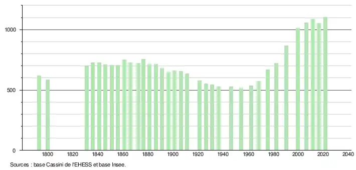 L'évolution du nombre d'habitants est connue à travers les recensements de la population effectués dans la commune depuis 1793. Pour les communes de moins de 10 000 habitants, une enquête de recensement portant sur toute la population est réalisée tous les cinq ans, les populations légales des années intermédiaires étant quant à elles estimées par interpolation ou extrapolation[48]. Pour la commune, le premier recensement exhaustif entrant dans le cadre du nouveau dispositif a été réalisé en 2006[49].