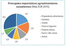 Malgré une production agricole et agroalimentaire significative, l’Arabie saoudite importe près de 80 % de ses besoins alimentaires, 22Mds€ en 2015. Les principaux postes sont les céréales (premier importateur mondial d’orge), les préparations alimentaires et les viandes (volailles principalement).