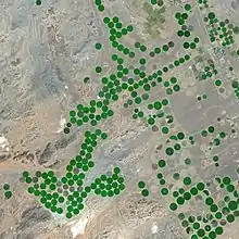 Sous le règne de Fahd Ier, la région du Nadj se métamorphose : les Saoudiens font pousser du blé dans le désert ; le sable cède la place à des centaines de cercles de blés verts au centre desquels des arroseurs automatiques font jaillir l'eau : les fermes circulaires[9]. Celle-ci provient de sources surexploitées depuis les années 1970 et désormais en voie de disparition[10]. L'agriculture consomme plus de 80 % de l’eau du Royaume, alors qu’elle ne fournit que 20 % de son alimentation. L’Arabie Saoudite décide pour limiter cette consommation excessive d'eau d’arrêter sa production de blé en 2016[11].