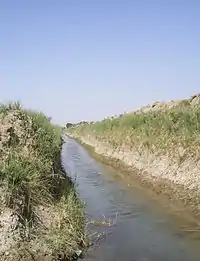 L'eau nécessaire pour l'irrigation était amenée vers les zones cultivées par des canaux[10]. Les plus grands et longs partaient directement des cours d’eau, et servaient de base à un réseau hiérarchisé de canaux de taille décroissante, jusqu’aux rigoles d’irrigation. Le relief du Sud étant extrêmement plat, les canaux principaux peuvent s'y étendre sur une quarantaine de kilomètres ou plus par endroits. Le système pouvait aussi comprendre des canaux surélevés et parfois des aqueducs, en fonction du relief. Des mécanismes régulateurs étaient en place pour contrôler l'écoulement et le niveau de l'eau, notamment des bassins qui pouvaient être fermés. Les sédiments apportés par les cours d'eau provoquant la surélévation de leur lit par rapport aux champs, l'eau pouvait irriguer le champ sans engin spécial, par percement d'une brèche sur la berge du canal en direction du champ où des rigoles répartissaient l'eau de manière homogène sur toute la surface en culture. Mais il existait également des engins élévatoires, comme le chadouf, attesté à partir de v. 2400 av. J.-C., puis la noria à partir du Ier millénaire. L'irrigation pouvait également s'effectuer depuis des puits dans les régions moins bien drainées[11],[12].