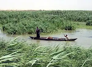 Les nombreux marécages de la partie sud de la Mésopotamie fournissaient différentes variétés de roseaux (surtout le roseau à balai commun) en grande quantité. Ils étaient récupérés pour différentes réalisations, notamment dans la construction de bâtiments (huttes, palissades, chaînages pour les murs de briques, etc.), de bateaux, mais aussi différents types d'objets de vannerie ainsi que les calames servant pour inscrire les tablettes cunéiformes en argile[67].