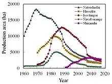 Depuis 1949, une stratégie de croisement par hybridation méthodique a permis de mettre sur le marché une nouvelle génération d'agrumes, principalement des tangors, dont certains comme le dekopon ont conquis le marché mondial[3]. Mais le dépeuplement des campagnes japonaises et la pénurie de main-d'œuvre qui en résulte pèsent sur la production d'agrume et le maintien du savoir-faire qui sont en baisse constante[4].