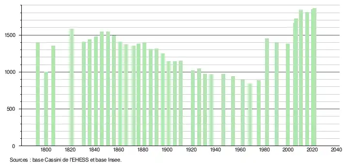 L'évolution du nombre d'habitants est connue à travers les recensements de la population effectués dans la commune depuis 1793. Pour les communes de moins de 10 000 habitants, une enquête de recensement portant sur toute la population est réalisée tous les cinq ans, les populations légales des années intermédiaires étant quant à elles estimées par interpolation ou extrapolation[26]. Pour la commune, le premier recensement exhaustif entrant dans le cadre du nouveau dispositif a été réalisé en 2005[27].