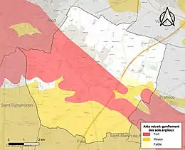 Les mouvements de terrains susceptibles de se produire sur la commune sont des tassements différentiels[21]. Le retrait-gonflement des sols argileux est susceptible d'engendrer des dommages importants aux bâtiments en cas d’alternance de périodes de sécheresse et de pluie[22]. 62,5 % de la superficie communale est en aléa moyen ou fort (54,9 % au niveau départemental et 48,5 % au niveau national)[Carte 2]. Depuis le , en application de la loi ELAN, différentes contraintes s'imposent aux vendeurs, maîtres d'ouvrages ou constructeurs de biens situés dans une zone classée en aléa moyen ou fort[Note 3],[23].