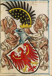 Après les Ascaniens, l'aigle rouge reste le symbole et l'emblème du Brandebourg sous les Wittelsbach, les Luxembourg et les Hohenzollern. En 1415, il passe à la maison de Hohenzollern. Ils sont désormais les seigneurs de la Marche de Brandebourg. Les armoiries de 1817 et 1824 montrent par erreur la couronne royale, comme pour l'aigle prussien. En 1864, il devient le chapeau de l'électeur pourpre et velouté, sans armure et bordé d'hermine. Le chapeau de l'électeur, le sceptre et l'épée sont attribués à l'aigle le 2 avril 1824 et les pièces de monnaie doivent être fabriquées avec ce changement. Les thalers sont frappés ainsi à partir de 1827. Par décret du 11 janvier 1864, les armoiries royales prussiennes de 1817 doivent être corrigées et, en souvenir de la dignité d'archichambreur du Saint-Empire dissous, le sceptre d'or dans le champ bleu, qui se trouvait dans les armoiries électorales et royales, doit être placé sur la poitrine de l'aigle comme plastron. L'armement, le couronnement et l'occupation de l'aigle, courants depuis 1824, ne sont pas nouveaux. En 1704 déjà, les détenteurs de l'écu tenaient dans leur main libre (donc à l'extérieur) l'aigle prussien à droite et l'aigle brandebourgeois à gauche dans l'étendard. Malheureusement, une erreur s'est glissée en 1824. Connue depuis 1804, elle est restée sans conséquence. Pour des raisons de place, les drapeaux sont tournés vers l'intérieur, comme dans le sceau de majesté de Frédéric II et de ses successeurs. L'aigle est tourné vers la hampe du drapeau en regardant. Il est héraldiquement son reflet. Ainsi, il tient l'épée avec la griffe, qui est proche de la hampe du drapeau. La griffe extérieure (museau) tient le sceptre. En 1804, les drapeaux sont à nouveau tournés vers l'extérieur. L'aigle regarde à nouveau vers la hampe du drapeau. L'épée et le sceptre sont toutefois échangés et il est ainsi devenu gaucher (l'épée à gauche). Il est armé à l'envers selon la représentation de 1704[3]