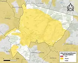Le retrait-gonflement des sols argileux est susceptible d'engendrer des dommages importants aux bâtiments en cas d’alternance de périodes de sécheresse et de pluie. 68,9 % de la superficie communale est en aléa moyen ou fort (67,4 % au niveau départemental et 48,5 % au niveau national). Sur les 960 bâtiments dénombrés sur la commune en 2019, 934 sont en aléa moyen ou fort, soit 97 %, à comparer aux 81 % au niveau départemental et 54 % au niveau national. Une cartographie de l'exposition du territoire national au retrait gonflement des sols argileux est disponible sur le site du BRGM[12],[13].