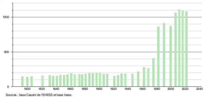 L'évolution du nombre d'habitants est connue à travers les recensements de la population effectués dans la commune depuis 1793. Pour les communes de moins de 10 000 habitants, une enquête de recensement portant sur toute la population est réalisée tous les cinq ans, les populations légales des années intermédiaires étant quant à elles estimées par interpolation ou extrapolation[24]. Pour la commune, le premier recensement exhaustif entrant dans le cadre du nouveau dispositif a été réalisé en 2006[25].