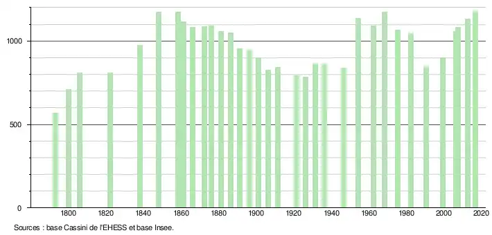L'évolution du nombre d'habitants est connue à travers les recensements de la population effectués dans la commune depuis 1793. Pour les communes de moins de 10 000 habitants, une enquête de recensement portant sur toute la population est réalisée tous les cinq ans, les populations légales des années intermédiaires étant quant à elles estimées par interpolation ou extrapolation[18]. Pour la commune, le premier recensement exhaustif entrant dans le cadre du nouveau dispositif a été réalisé en 2007[19].
