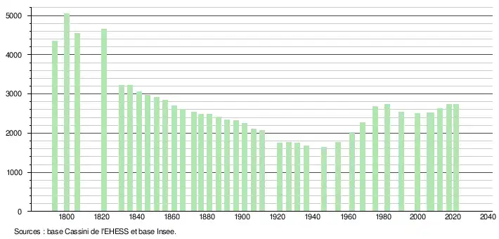 - Population municipale légale en vigueur au 1er janvier 2024, millésimée 2021, définie dans les limites territoriales en vigueur au 1er janvier 2023, date de référence statistique : 1er janvier 2021.