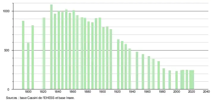 L'évolution du nombre d'habitants est connue à travers les recensements de la population effectués dans la commune depuis 1793. Pour les communes de moins de 10 000 habitants, une enquête de recensement portant sur toute la population est réalisée tous les cinq ans, les populations légales des années intermédiaires étant quant à elles estimées par interpolation ou extrapolation[18]. Pour la commune, le premier recensement exhaustif entrant dans le cadre du nouveau dispositif a été réalisé en 2008[19].