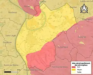 Le retrait-gonflement des sols argileux est susceptible d'engendrer des dommages importants aux bâtiments en cas d’alternance de périodes de sécheresse et de pluie[23]. La totalité de la commune est en aléa moyen ou fort (91,8 % au niveau départemental et 48,5 % au niveau national)[Carte 2]. Depuis le , en application de la loi ELAN, différentes contraintes s'imposent aux vendeurs, maîtres d'ouvrages ou constructeurs de biens situés dans une zone classée en aléa moyen ou fort[Note 3],[24].
