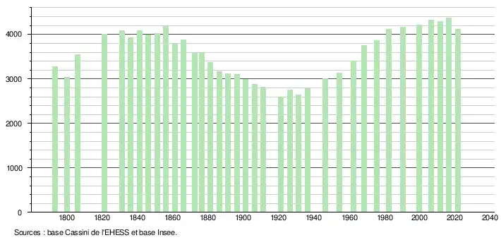 L'évolution du nombre d'habitants est connue à travers les recensements de la population effectués dans la commune depuis 1793. Pour les communes de moins de 10 000 habitants, une enquête de recensement portant sur toute la population est réalisée tous les cinq ans, les populations légales des années intermédiaires étant quant à elles estimées par interpolation ou extrapolation[29]. Pour la commune, le premier recensement exhaustif entrant dans le cadre du nouveau dispositif a été réalisé en 2006[30].