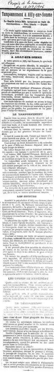 ![]() Le Progrès de la Somme Tamponnement à Ailly-sur-Somme Cinq blessés. - Dégâts énormes. « Le train rapide Calais-Bâle a coupé en deux un train de marchandises, en manœuvres, en gare d'Ailly-sur-Somme ; il y a de nombreux blessés. ». Telle était la laconique autant que grave nouvelle qui nous parvenait hier soir. Confirmée à la gare du Nord, cette dépêche ne pouvait nous être plus expliquée, et aussitôt nous envoyions un de nos collaborateurs sur les lieux de l'accident, qui aurait pu dégénérer en catastrophe, sans des circonstances heureuses, comme (on) le verra plus loin. À notre arrivée à Ailly-sur-Somme, le spectacle est effrayant. La gare est en partie démolie, la marquise a disparu, les sémaphores sont renversés, les remises de pompes et les dépendances de la gare n'existent plus. Locomotives, fourgons, wagons sont en travers des voies, totalement obstruées et elles-mêmes arrachées. Tout cela éclairé par des lampes puissantes qui projettent sur tous ces débris des lueurs tragiques. Un va-et-vient continuel d'hommes d'équipe, d'employés, agitant leurs lanternes ou leurs signaux ne contribue pas peu à rendre le spectacle fantastique, pendant que les voyageurs qu'on transborde, errent éperdus à travers les débris des trains tamponnés. Une foule énorme de curieux se presse le long des barrières du chemin de fer, celles qui ont été épargnées, et tout ce monde est maintenu à grand peine par les gardes, les gendarmes et les pompiers d'Ailly-sur-Somme. Comme bien on pense, dans le désarroi qui a suivi le tamponnement, les renseignements sont difficiles à recueillir, les commentaires cependant vont leur train, et il nous faudrait des colonnes pour les rapporter ici. Prenons donc la version qui nous en a été donnée par un des premiers témoins de l'accident. Il était 6 heures du soir, l'orage qui venait d'éclater battait son plein, et peu de monde était dehors, pour cette raison justement. Tout à coup un bruit formidable se fit entendre et la gare d'Ailly-sur-Somme disparut sous un épais nuage de fumée. En même temps des cris se faisaient entendre, des appels « Au secours ! » partaient de la gare. Les voisins, MM. Gabriel ESTAGNOL, BATTEUX, le chef de gare M. MATHAN, etc. accoururent et se rendirent compte de ce qui s'était produit. Le Calais-Bâle avait tamponné un train de marchandises en manœuvres, demeuré on ne sait encore pourquoi sur la voie et les deux convois s'étaient télescopés. La locomotive du rapide était culbutée sur la voie montante, pendant que la machine du train de marchandises tombait de l'autre côté. Wagons et fourgons se disloquaient et l'un d'eux entrait dans les dépendances de la gare, pendant qu'un wanon-couloir, formant bélier, démolissait une maison inhabitée, située à la sortie du passage à niveau d'Ailly à Saint-Sauveur. La marquise de la gare arrachée ainsi que les sémaphores venaient barrer le passage à niveau qui, de ce fait, se trouve absolument bouché. Aussitôt la population d'Ailly-sur-Somme, dont le dévouement est au-dessus de tout éloge se portèrent à la gare, M. BATTEUX, commandant des pompiers, fit battre "la générale" rappelant ses hommes, les gardes champêtres BATTEUX d'Ailly, ORIAL de Saint-Sauveur, PARIS d'Argœuves, etc., organisèrent le service d'ordre ; les gendarmes de Picquigny descendirent au galop et on s'occupa des blessés. Le chauffeur du rapide était assez grièvement blessé, il avait l'épaule fracturée, des voyageurs, la plupart des Anglais, étaient contusionnés. On les transporta dans les maisons voisines, où ils reçurent les premiers soins de M. le docteur CHEVALIER d'Argœuves, aidé de M. GUÉRIN, pharmacien à Ailly. Pendant ce temps, un train de secours partait d'Amiens, amenant du matériel, une équipe d'ouvriers, des docteurs, des ingénieurs et des inspecteurs. Tous se multiplièrent et parvinrent à ramener le calme. Il ne pouvait plus être question de circulation de trains et un service de transbordement dut être opéré en deçà et au-delà de la gare d'Ailly-sur-Somme. Là encore les pompiers d'Ailly-sur-Somme furent superbes, ils aidaient les voyageurs à traverser les voies encombrées de débris et les guidaient jusqu'à leur train, soutenant les femmes et portant les enfants. Les communications téléphoniques ou télégraphiques étaient interrompues par suite du bris des poteaux, c'est ce qui explique le peu de renseignements arrivés à Amiens, dans la soirée. Quelles sont les causes de cet accident et où sont les responsabilités ? Nous savons qu'une enquête a été ouverte sur le champ, mais on comprendra notre réserve sur ce point, encore mal éclairci. Quoi qu'il en soit, il semble extraordinaire qu'un train ait pu rester sur une voie, comme celle de Paris-Calais, au moment du passage d'un rapide. Quand nous quittons Ailly-sur-Somme, à 10 h et demi du soir, les ouvriers de la Compagnie se dépensent en efforts surhumains pour déblayer les voies. C'est un travail qui durera plusieurs jours étant donné l'état pitoyable des lieux du tamponnement. De toutes les communes voisines, les curieux sont venus en grand nombre et ils suivent avec intérêt ces travaux peu communs. Les dernières nouvelles reçues sur les blessés sont bonnes. Aucun n'est en danger actuellement. Inutile d'ajouter que la nouvelle de ce tamponnement a jeté à Amiens une émotion très vive. Nous avons rencontré, à Ailly-sur-Somme, nombre de nos concitoyens qui accouraient aux renseignements, ayant des parents ou des amis partis dans le Calais-Bâle. Signalons encore ce détail : Tous les soirs, les 200 ou 300 ouvriers de St-Sauveur attendent, devant le passage à niveau, le passage de l'express. Or, ce soir, le mauvais temps leur avait fait retarder leur départ. Grâce à ce contre-temps, l'accident n'a pas été horrible. On ne peut songer sans frémir à l'hécatombe qui se serait produite si les monstres de fer étaient ve