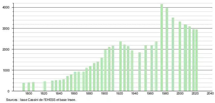 L'évolution du nombre d'habitants est connue à travers les recensements de la population effectués dans la commune depuis 1793. Pour les communes de moins de 10 000 habitants, une enquête de recensement portant sur toute la population est réalisée tous les cinq ans, les populations légales des années intermédiaires étant quant à elles estimées par interpolation ou extrapolation[21]. Pour la commune, le premier recensement exhaustif entrant dans le cadre du nouveau dispositif a été réalisé en 2007[22].