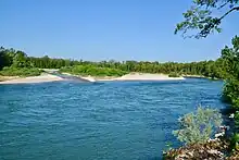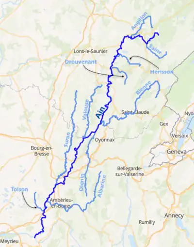 L'Ain est une rivière française qui prend sa source (une exsurgence karstique) en Bourgogne-Franche-Comté, entre les villages jurassiens de Conte et de La Favière à 681 mètres d'altitude, et se jette dans le Rhône (rive droite) à Anthon (Isère), après avoir parcouru 189,9 kilomètres[1]. Elle a donné son nom au département de l'Ain. Les riverains et plus généralement les locuteurs des départements du Jura et de l'Ain[5] la désignent sous le terme « rivière d'Ain », qui a pour avantage de lever l'ambiguïté avec le département. Dans la littérature scientifique, on retrouve quelquefois l'adjectif idanien (-ne) pour désigner des reliefs proches de la rivière d'Ain, ou des régions situées dans le département de l'Ain. Cet adjectif a été formé à partir d'Idanus, qui désignait l'Ain en latin.