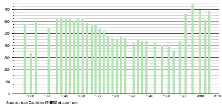 L'évolution du nombre d'habitants est connue à travers les recensements de la population effectués dans la commune depuis 1793. À partir du , les populations légales des communes sont publiées annuellement dans le cadre d'un recensement qui repose désormais sur une collecte d'information annuelle, concernant successivement tous les territoires communaux au cours d'une période de cinq ans. Pour les communes de moins de 10 000 habitants, une enquête de recensement portant sur toute la population est réalisée tous les cinq ans, les populations légales des années intermédiaires étant quant à elles estimées par interpolation ou extrapolation[14]. Pour la commune, le premier recensement exhaustif entrant dans le cadre du nouveau dispositif a été réalisé en 2005[15],[Note 2].