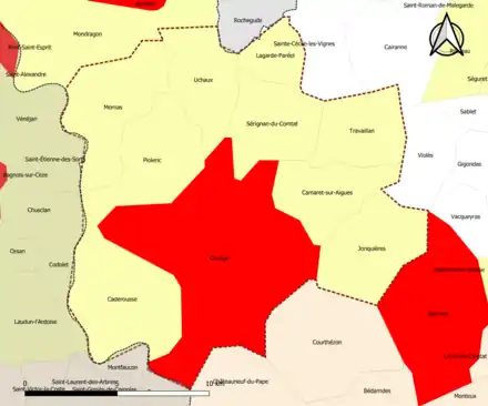| Uchaux | 84135 | Vaucluse | commune de la couronne | 18,48 | 1 688 (2021) | 91 |