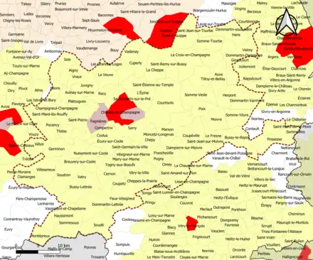 Localisation de l'aire d'attraction de Châlons-en-Champagne dans le département de la Marne. | |