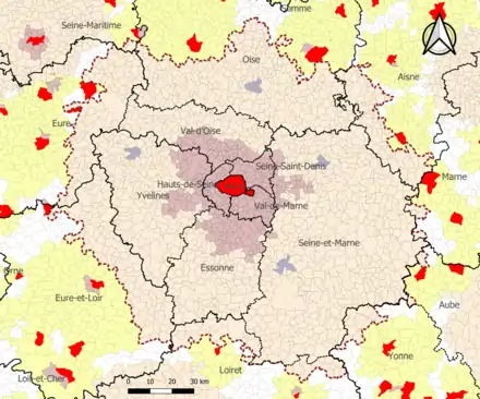 L’aire d'attraction de Paris est une aire inter-régionale qui comporte 1 929 communes : la totalité des communes d'Île-de-France, 292 situées dans l'Oise, 116 dans l'Eure, 116 en Eure-et-Loir, 72 dans l'Aisne, 40 dans le Loiret, 15 dans l'Yonne, 5 dans la Marne, 3 dans l'Aube, 2 dans la Seine-Maritime[4].