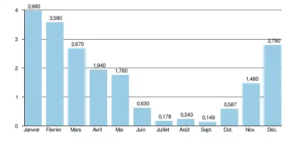 Cependant, à l'étiage, le VCN3 peut chuter jusque 0,001 m3/s, en cas de période quinquennale sèche, et le cours d'eau se retrouve ainsi totalement à sec[2].