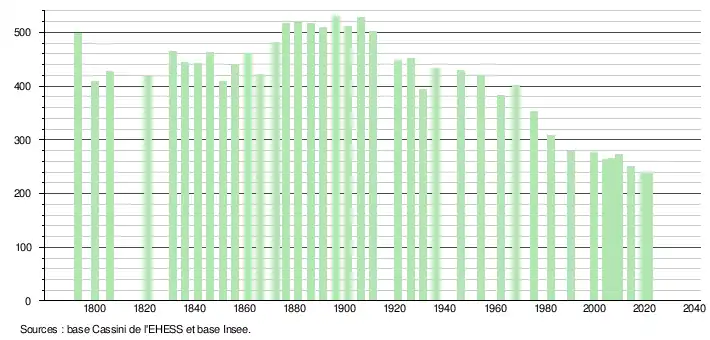 L'évolution du nombre d'habitants est connue à travers les recensements de la population effectués dans la commune depuis 1793. Pour les communes de moins de 10 000 habitants, une enquête de recensement portant sur toute la population est réalisée tous les cinq ans, les populations légales des années intermédiaires étant quant à elles estimées par interpolation ou extrapolation[22]. Pour la commune, le premier recensement exhaustif entrant dans le cadre du nouveau dispositif a été réalisé en 2004[23].