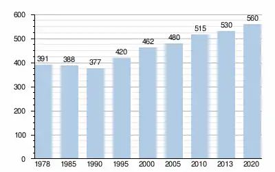 Le graphique suivant représente l'évolution du nombre d'habitants du village depuis le premier recensement de la commune d'Aubange après la fusion des communes, soit en 1978[5]: