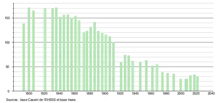 L'évolution du nombre d'habitants est connue à travers les recensements de la population effectués dans la commune depuis 1793. Pour les communes de moins de 10 000 habitants, une enquête de recensement portant sur toute la population est réalisée tous les cinq ans, les populations légales des années intermédiaires étant quant à elles estimées par interpolation ou extrapolation[14]. Pour la commune, le premier recensement exhaustif entrant dans le cadre du nouveau dispositif a été réalisé en 2007[15].