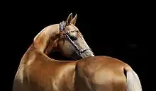 L'Akhal-Téké possède un port de tête altier, la tête étant implantée à un angle d'environ 45°[47]