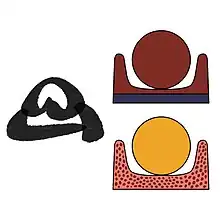 Il représente le soleil (hiéroglyphe N5) entre un horizon de deux collines ou montagnes (hiéroglyphe N26). Les collines sont parfois roses avec des grains de sable figurés par des points. Le socle bleu (Voir N25 et N26) devient commun à la fin du Nouvel Empire. Il est translittéré ȝḫt.