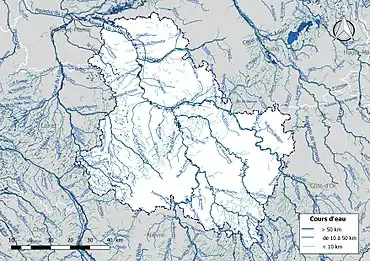 La base de données Carthage est le référentiel du réseau hydrographique français. Cette base est réalisée à partir de la couche hydrographie de la base de données Carto enrichie par le ministère chargé de l'environnement et les agences de l'eau avec le découpage du territoire en zones hydrographiques d'une part et la codification de ces zones et du réseau hydrographique d'autre part[3]. De cette base, il ressort que le réseau hydrographique de l'Yonne comprend 62 cours d'eau permanents de longueur supérieure à 10 km et dont le cours est en partie ou en totalité dans le département de l'Yonne[4].